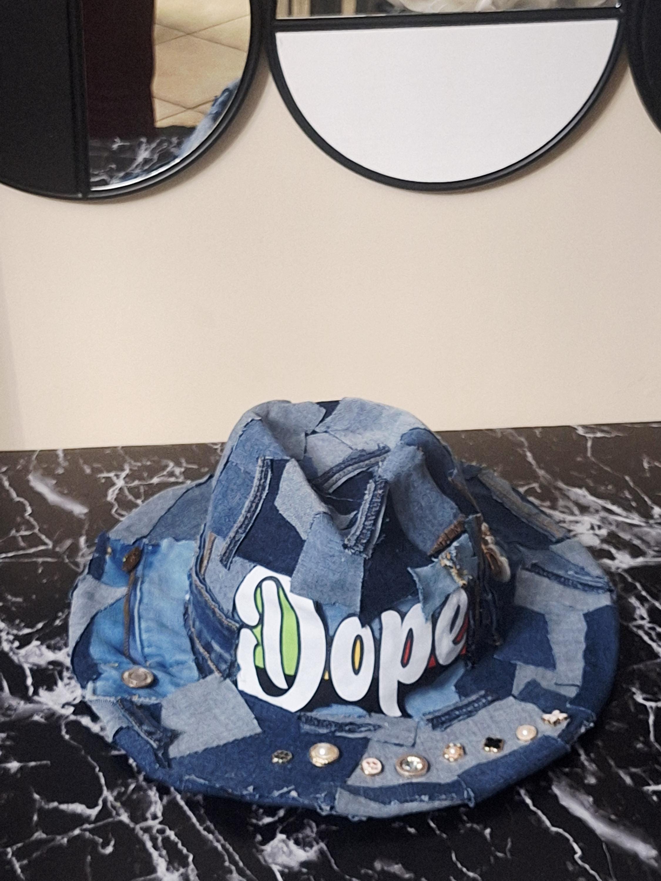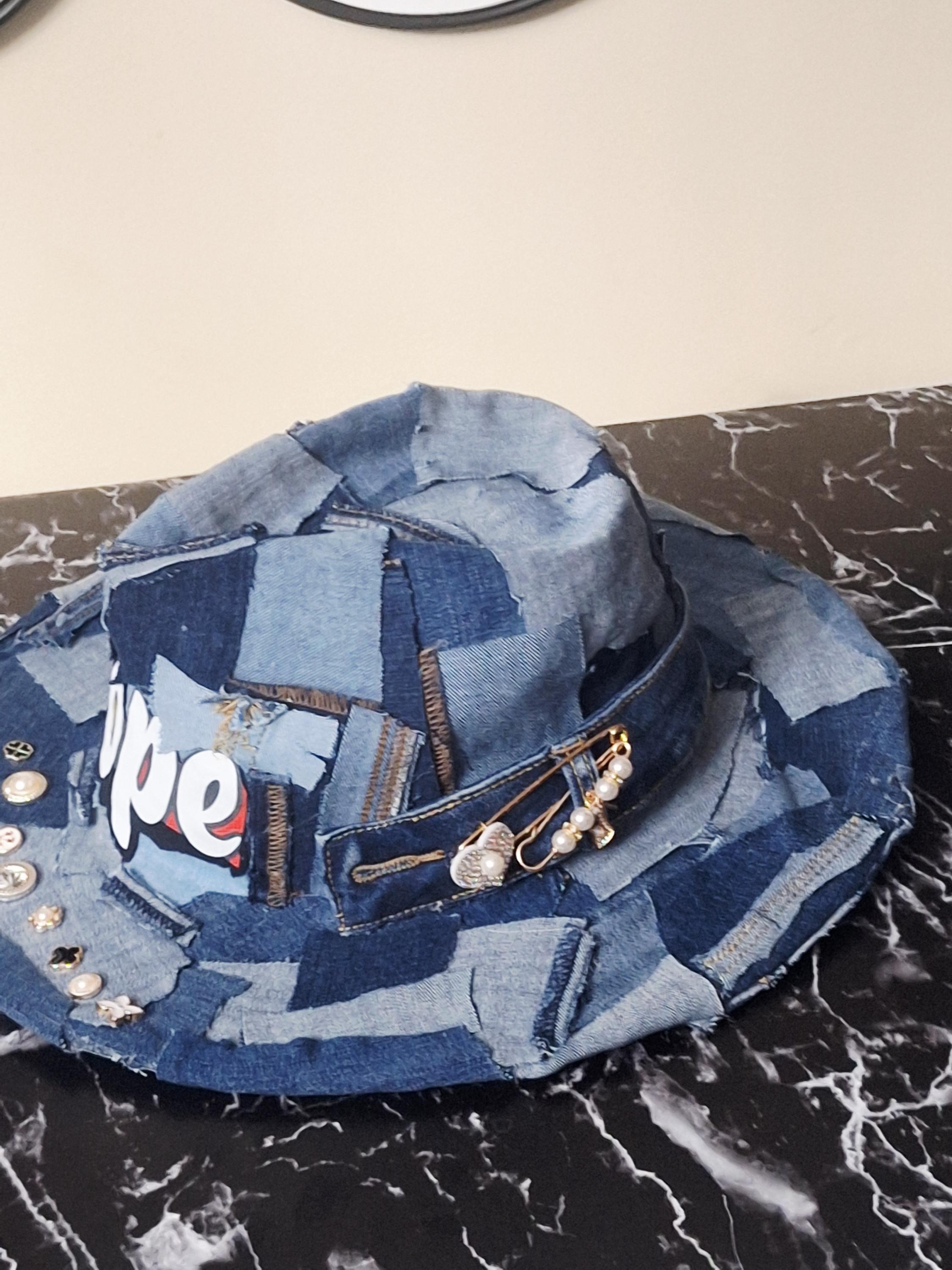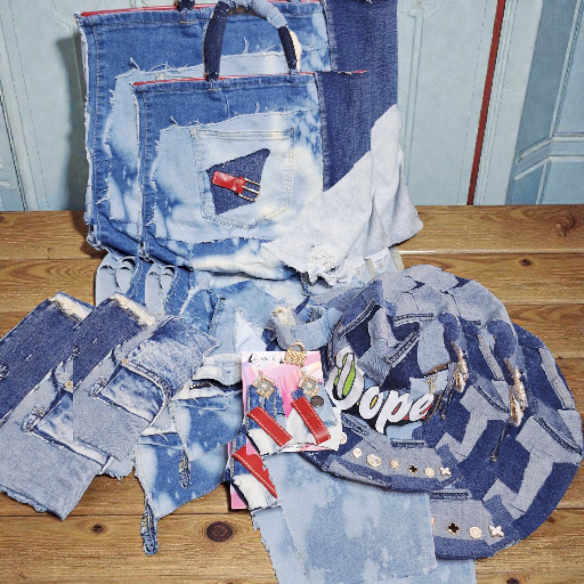 This is a handmade denim mixed, upcycled and revamped handbag set with matching wallet clutch, earrings, cowboy hat and denim bangle.. It is made using bleached denim jeans and upcycled handbag.