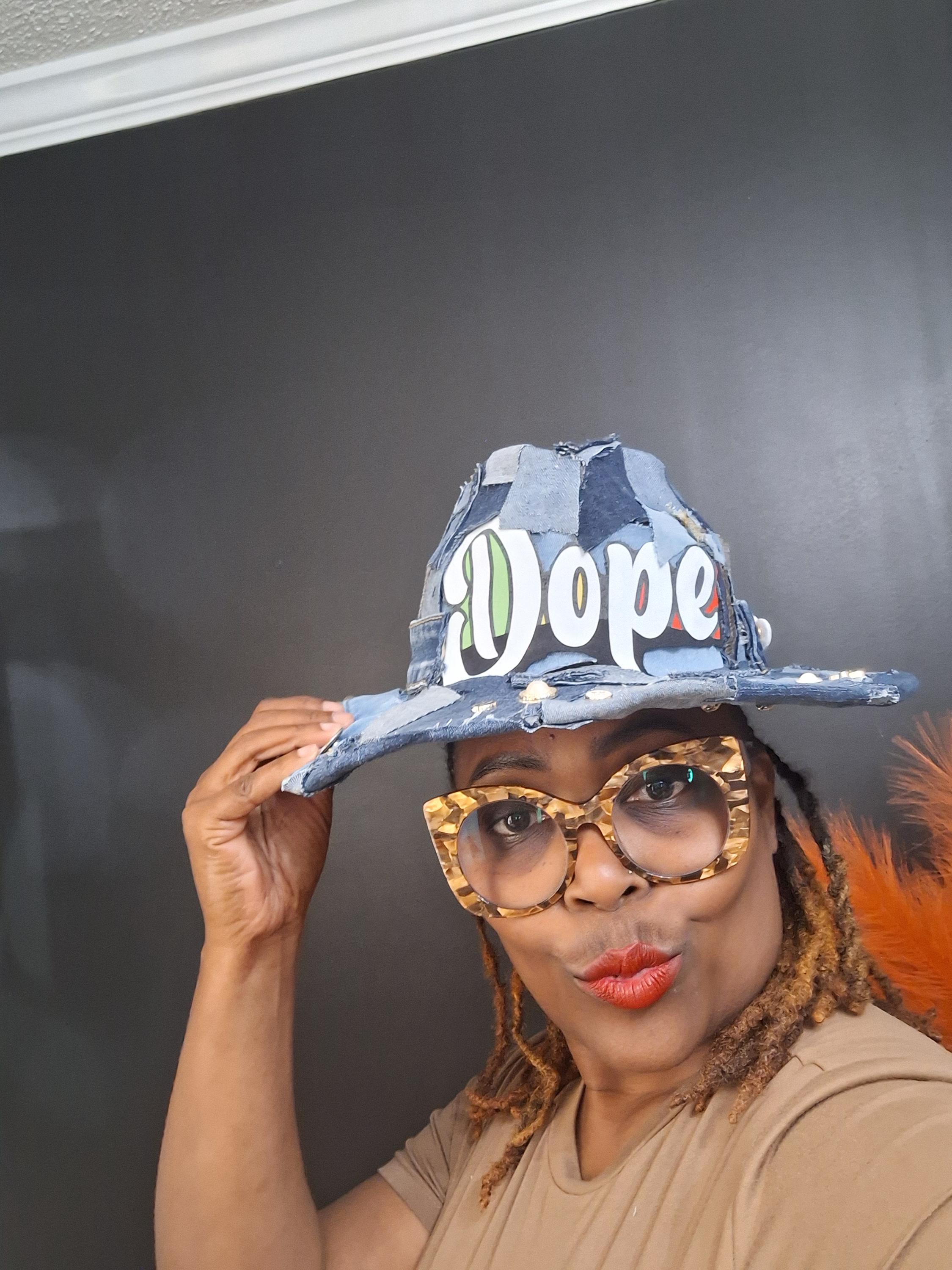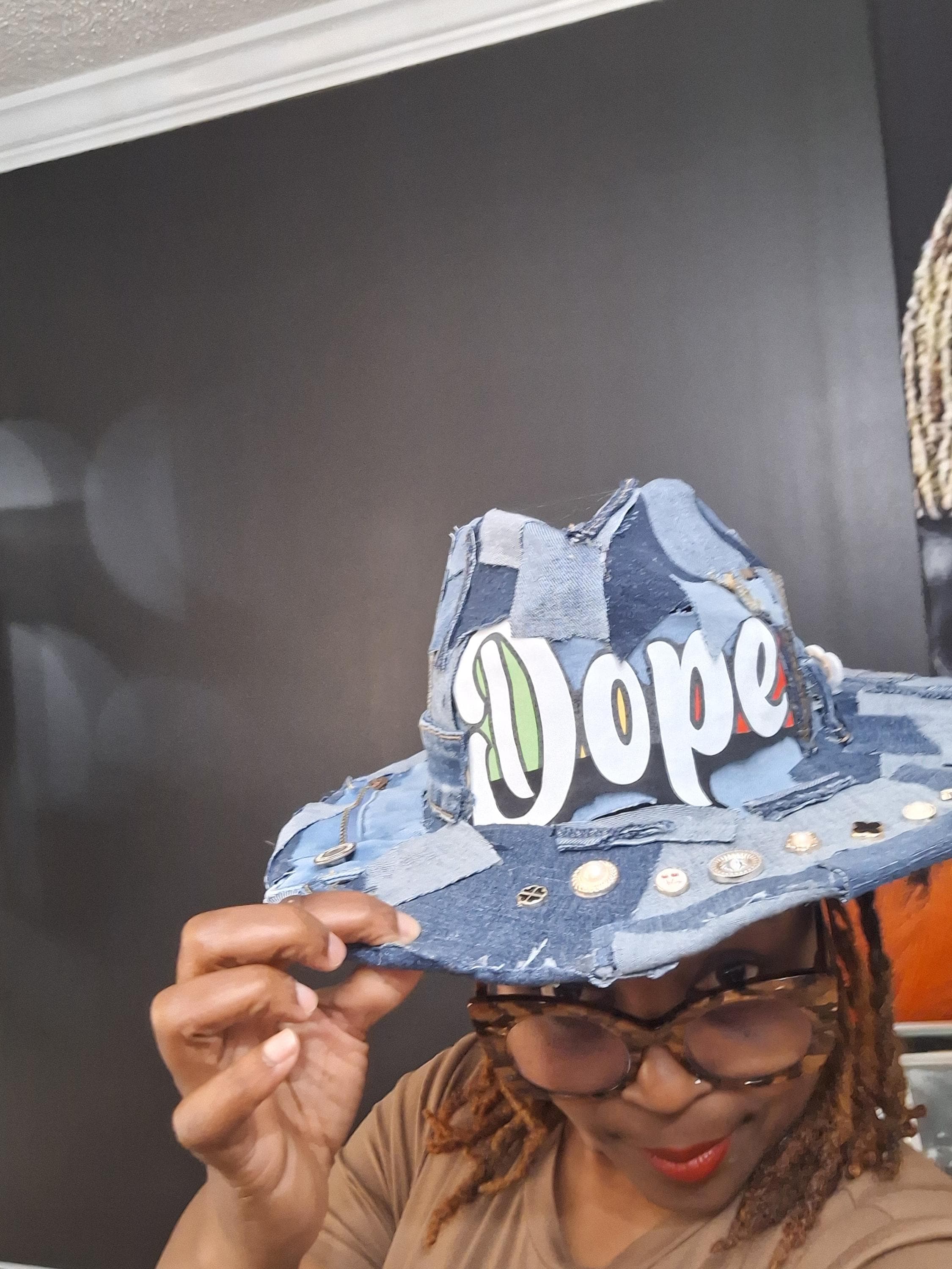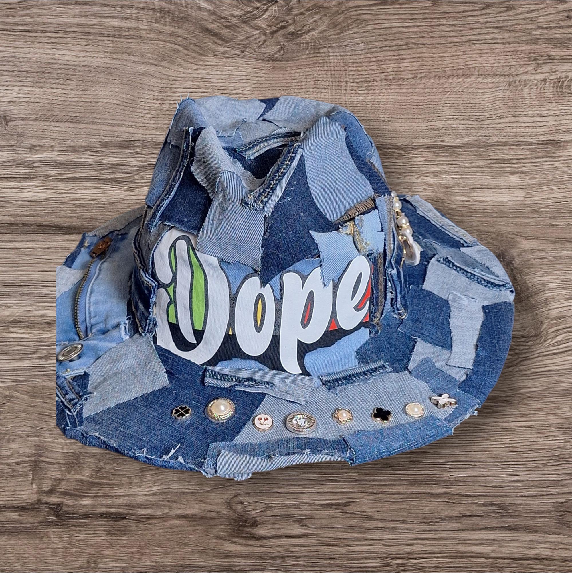 This is a handmade denim mixed, upcycled and revamped handbag set with matching wallet clutch, earrings, cowboy hat and denim bangle.. It is made using bleached denim jeans and upcycled handbag.