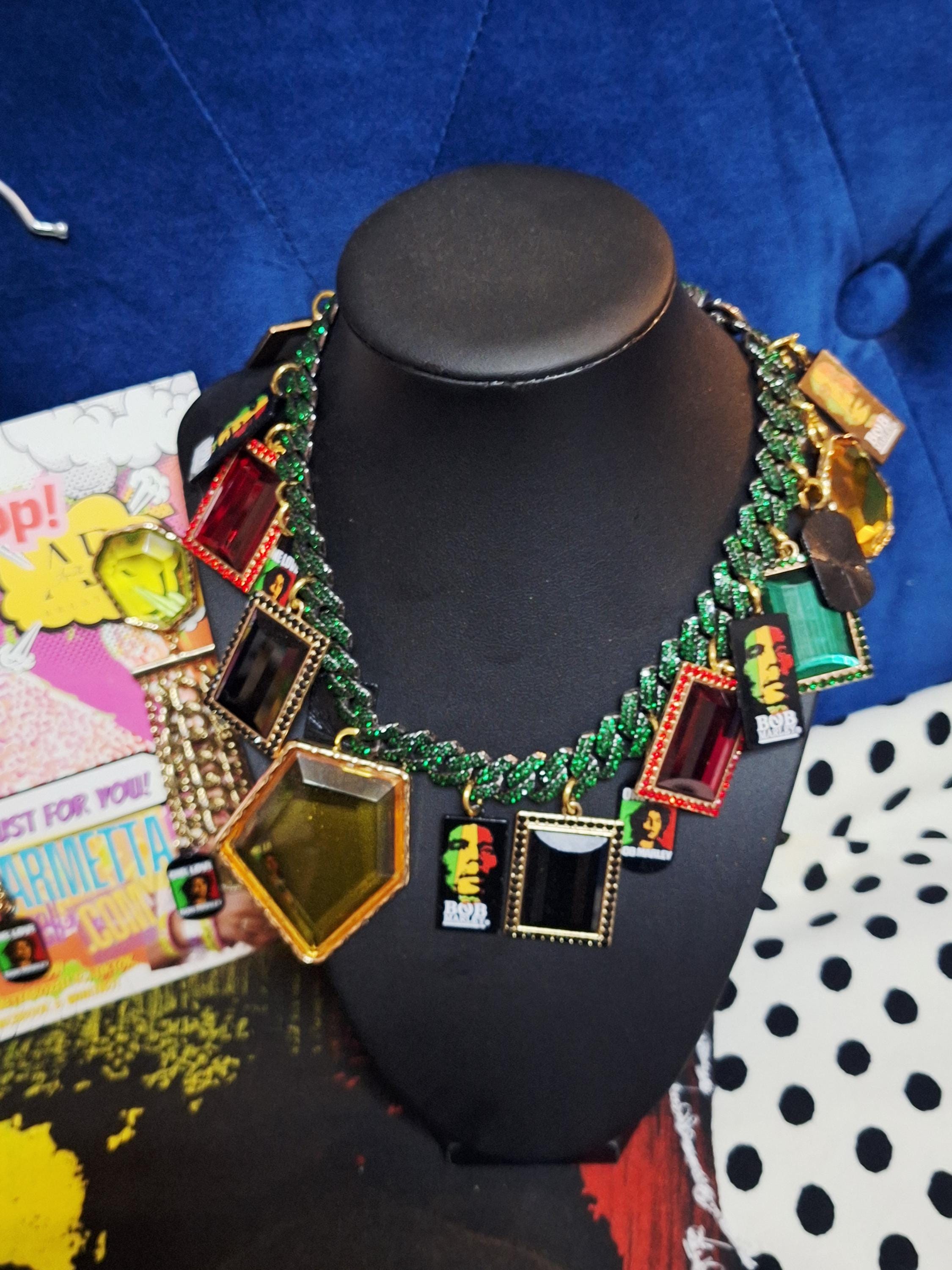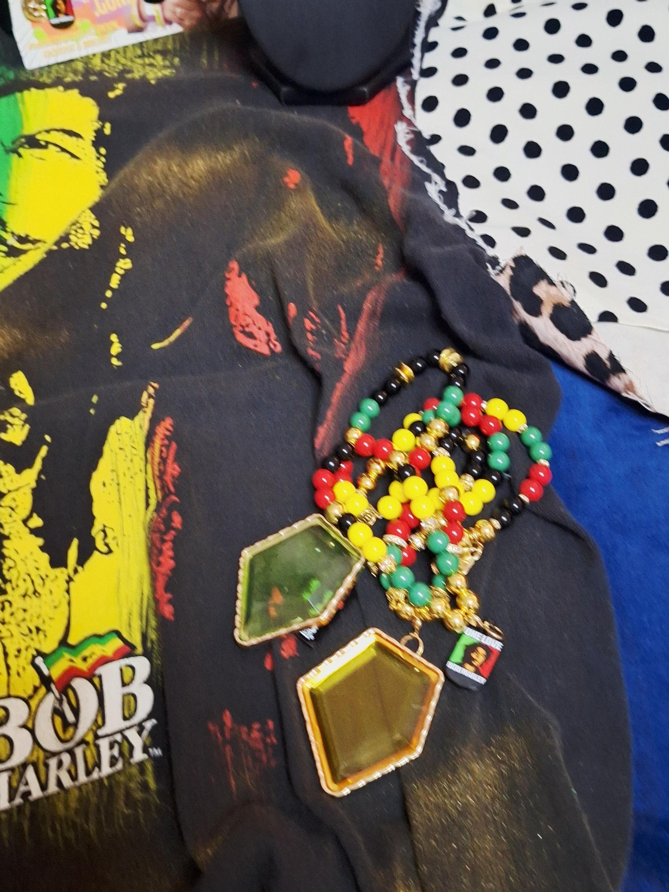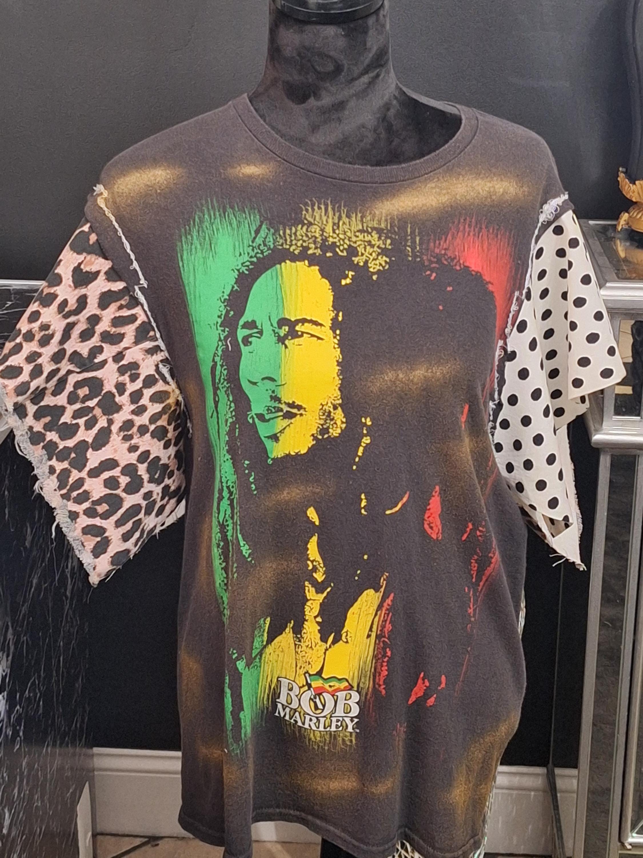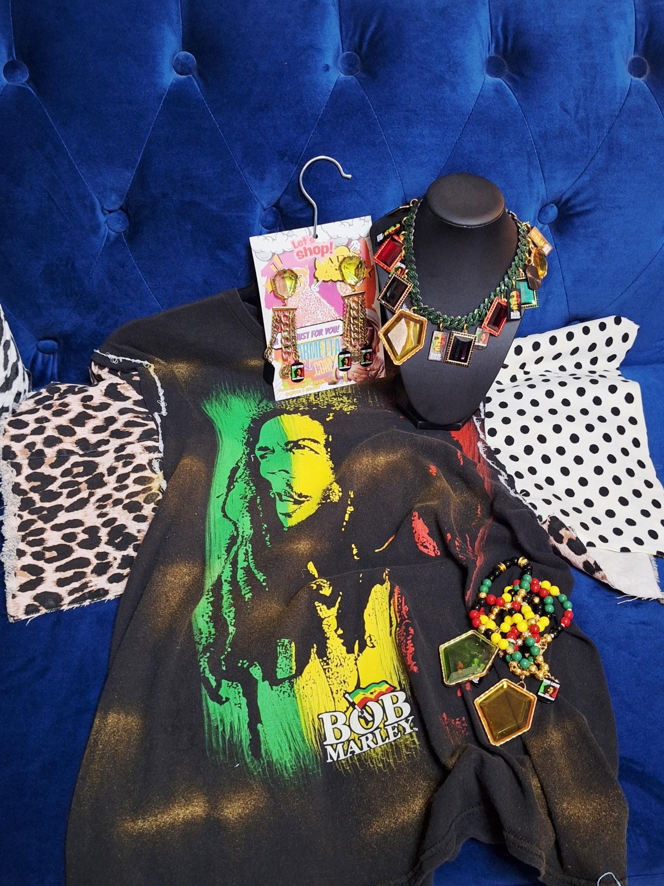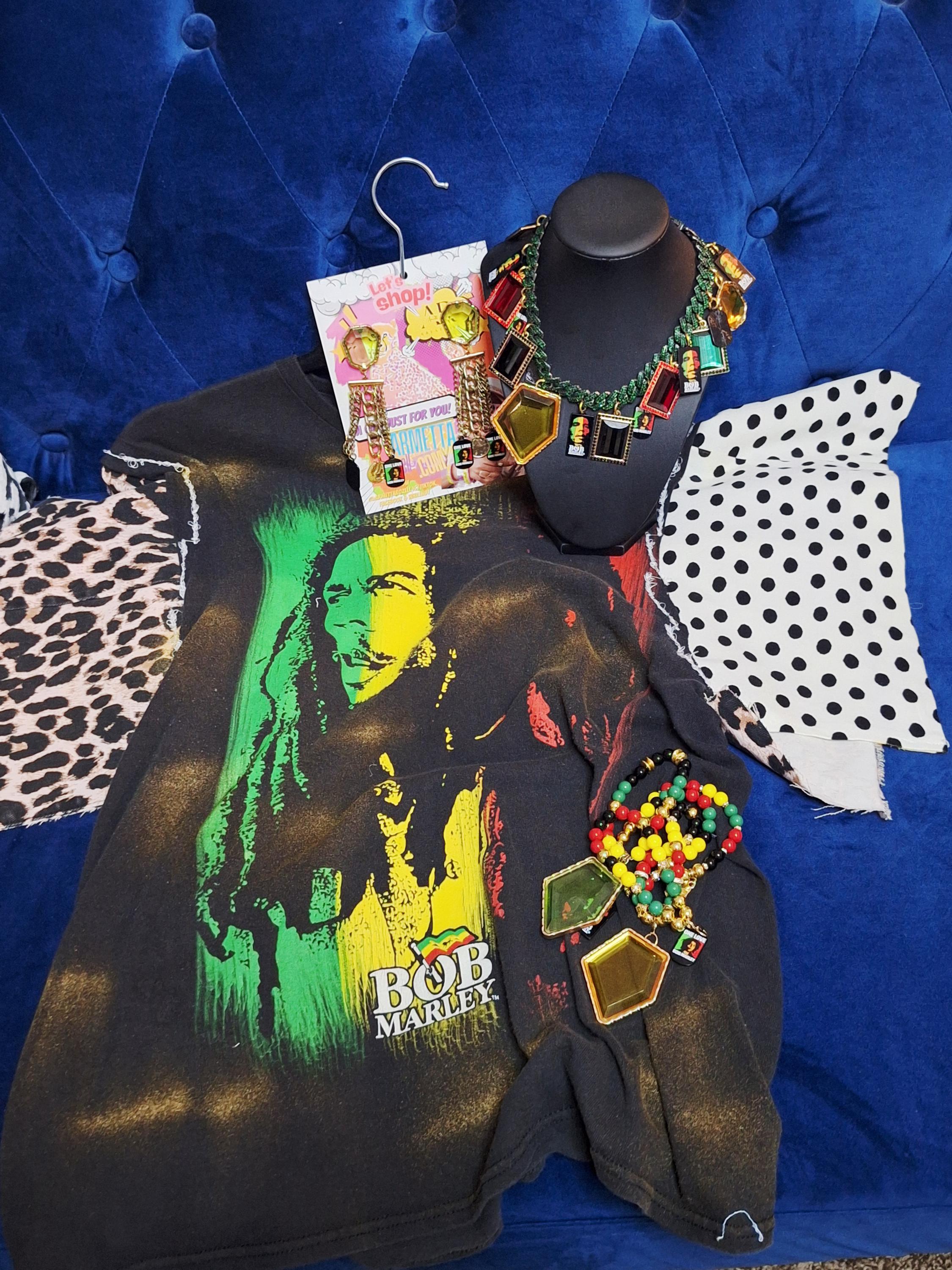 This is a upcycled Bob Marley boho tshirt set with matching accessories.
