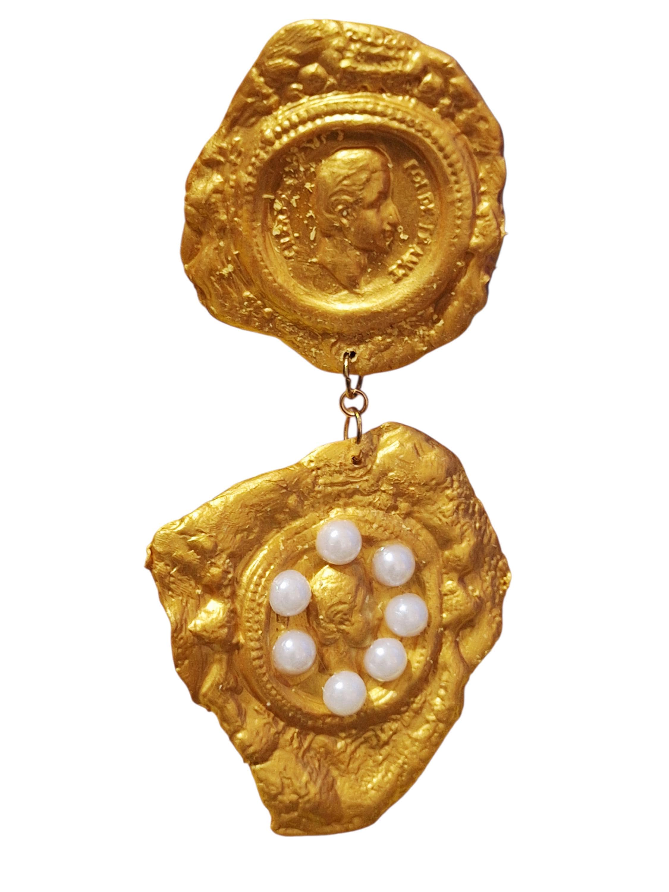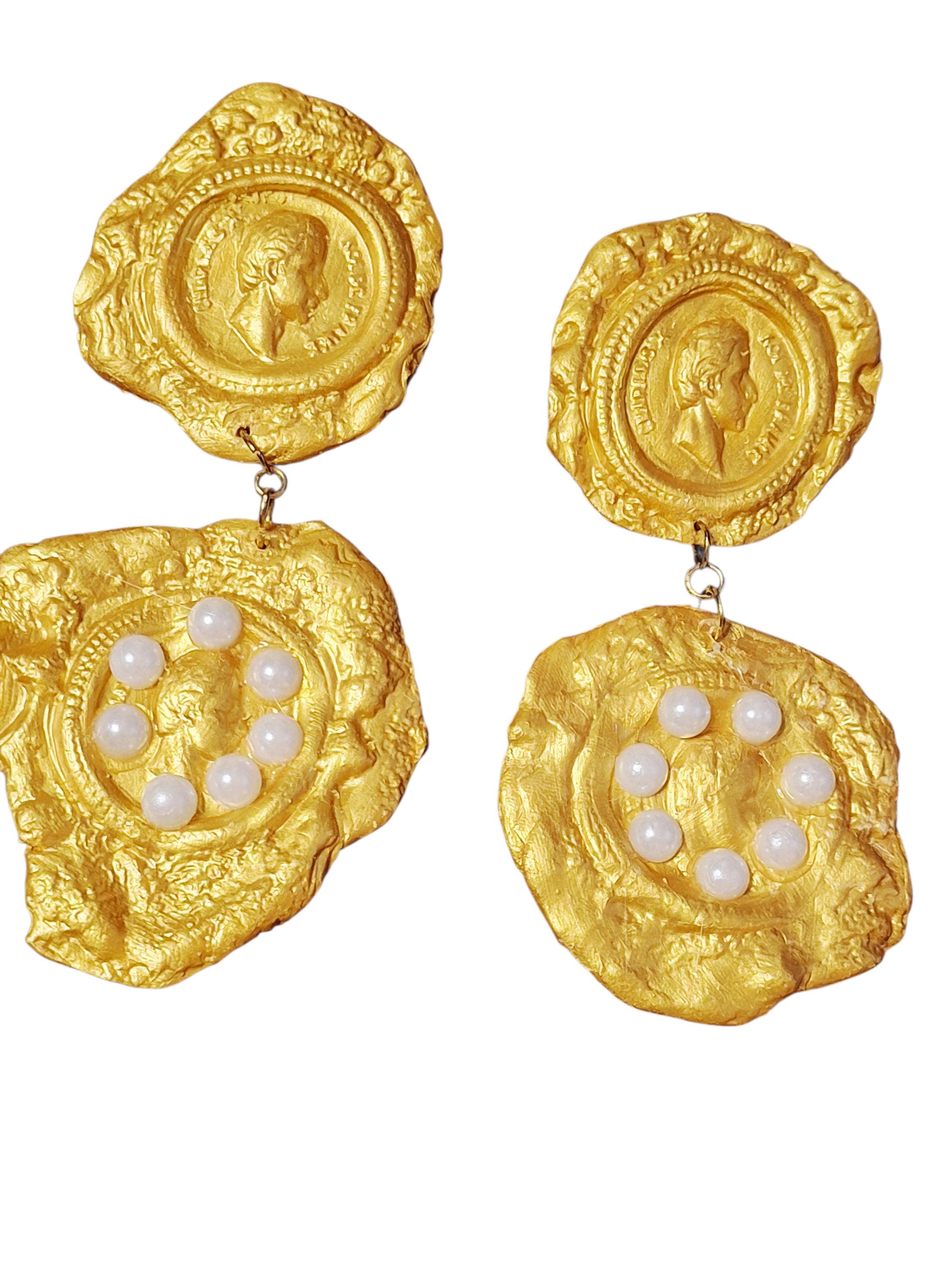 Vintage Gold Handmade Textured Clay Earrings: Coin Dangle Statement Earrings