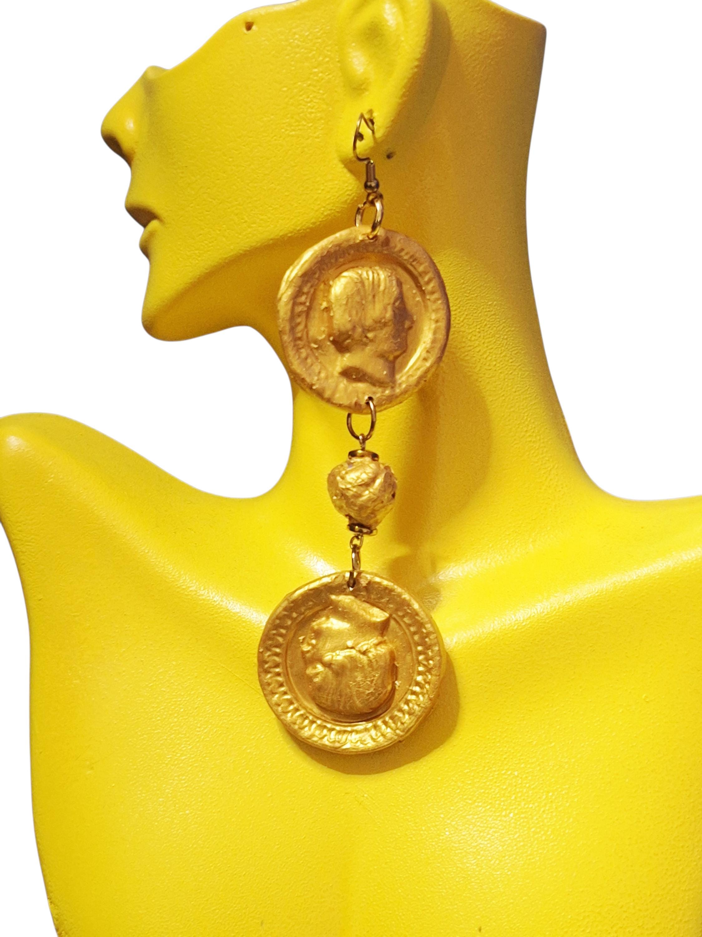 Vintage Gold Handmade Textured Clay Earrings: Coins Dangle Statement Earrings
