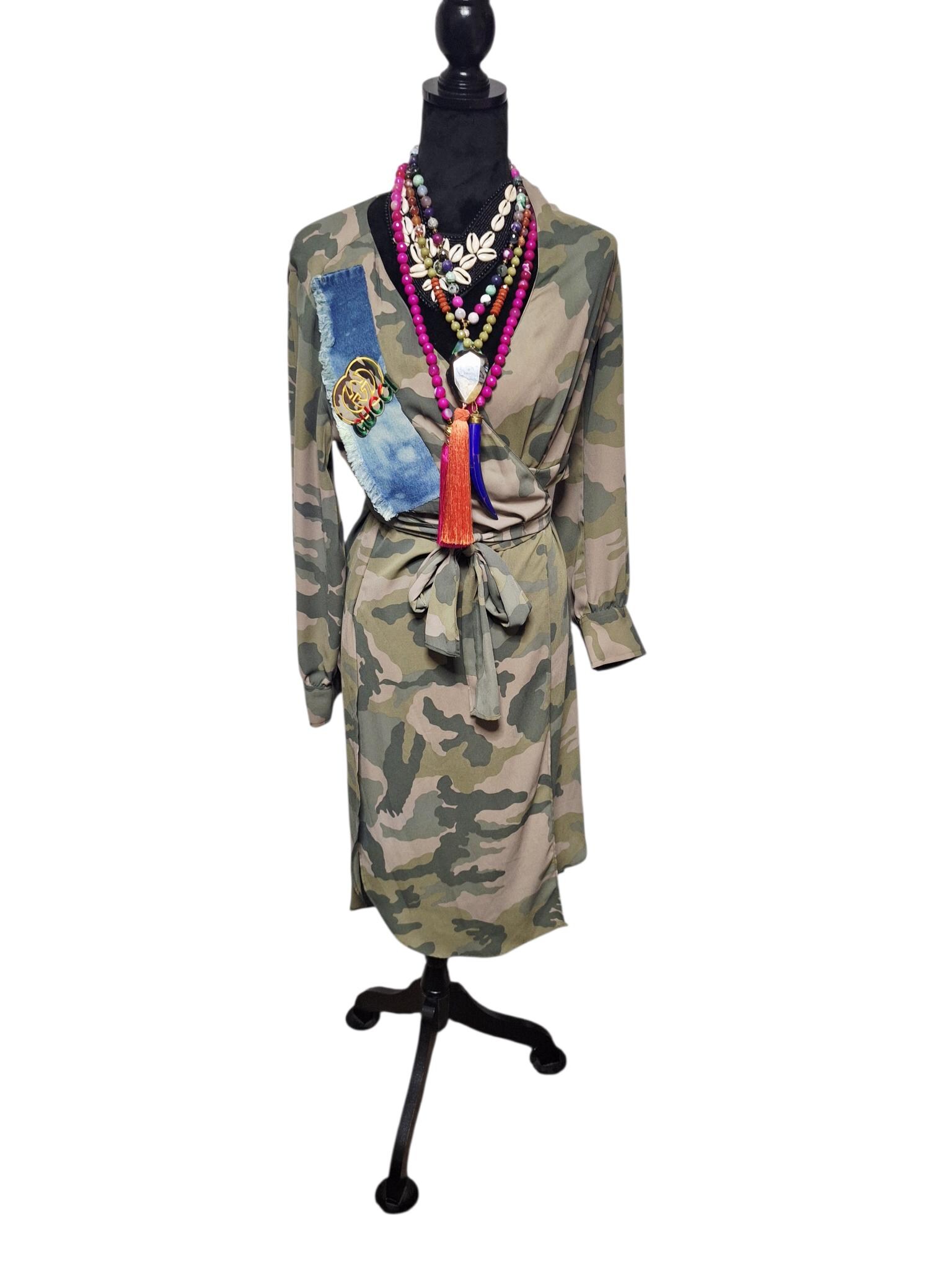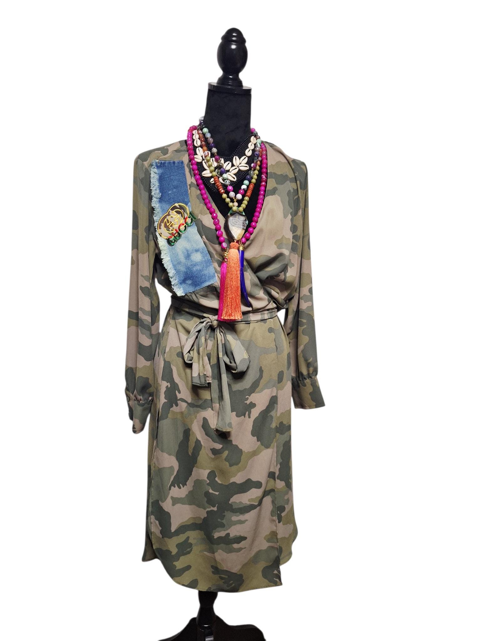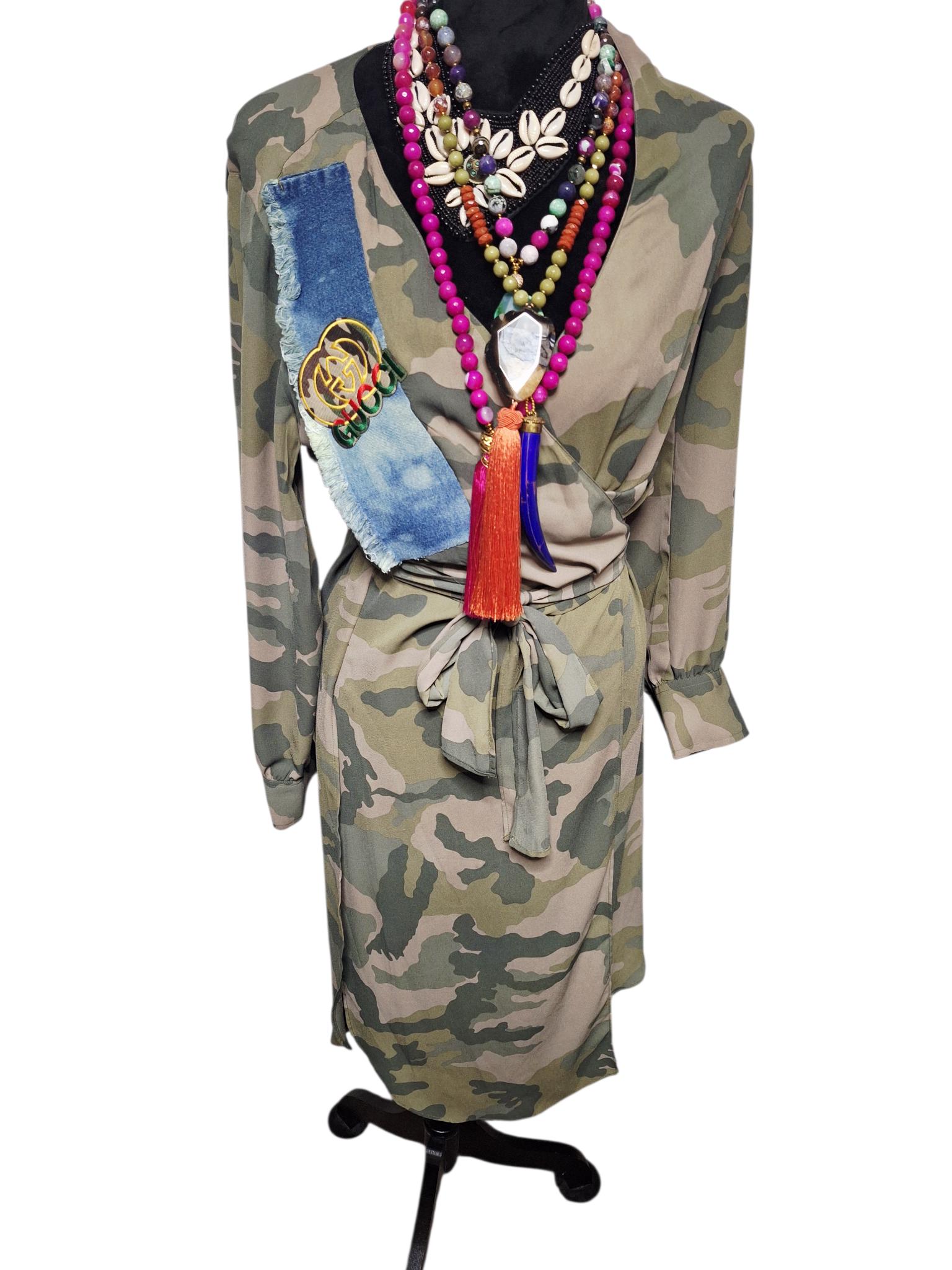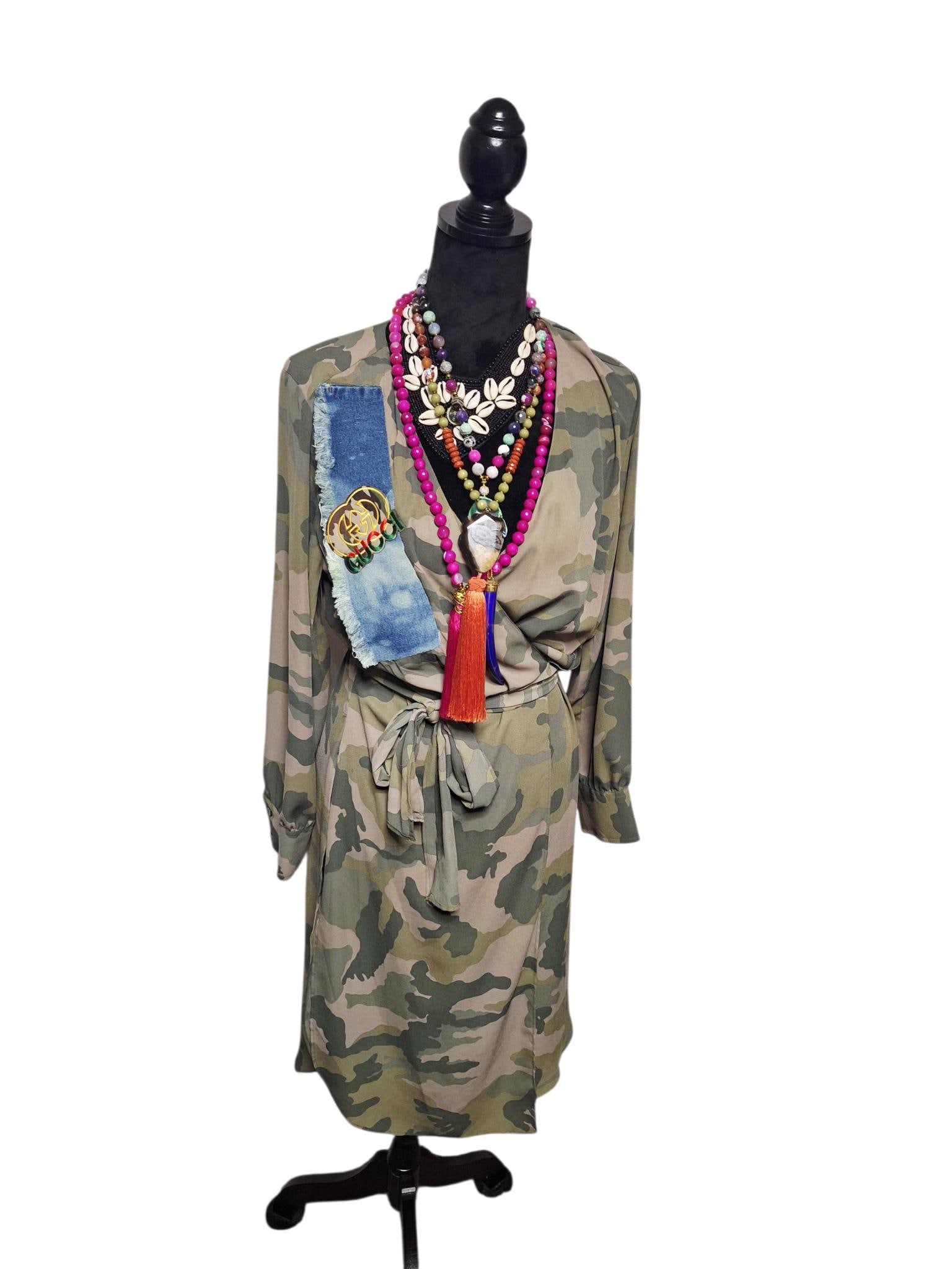 One-of-a-kind of a kind Upcycled women wrapped split tunic dress.