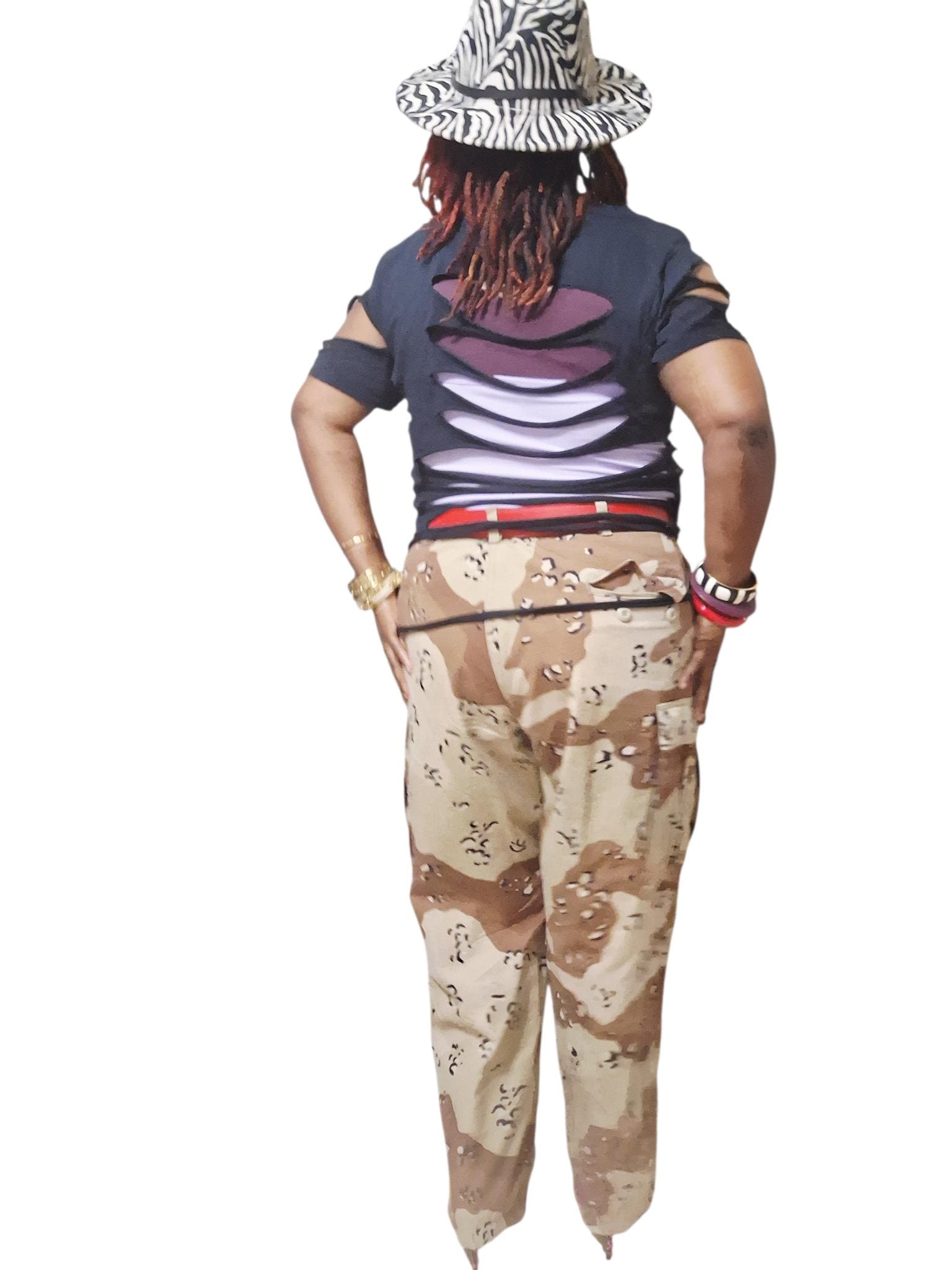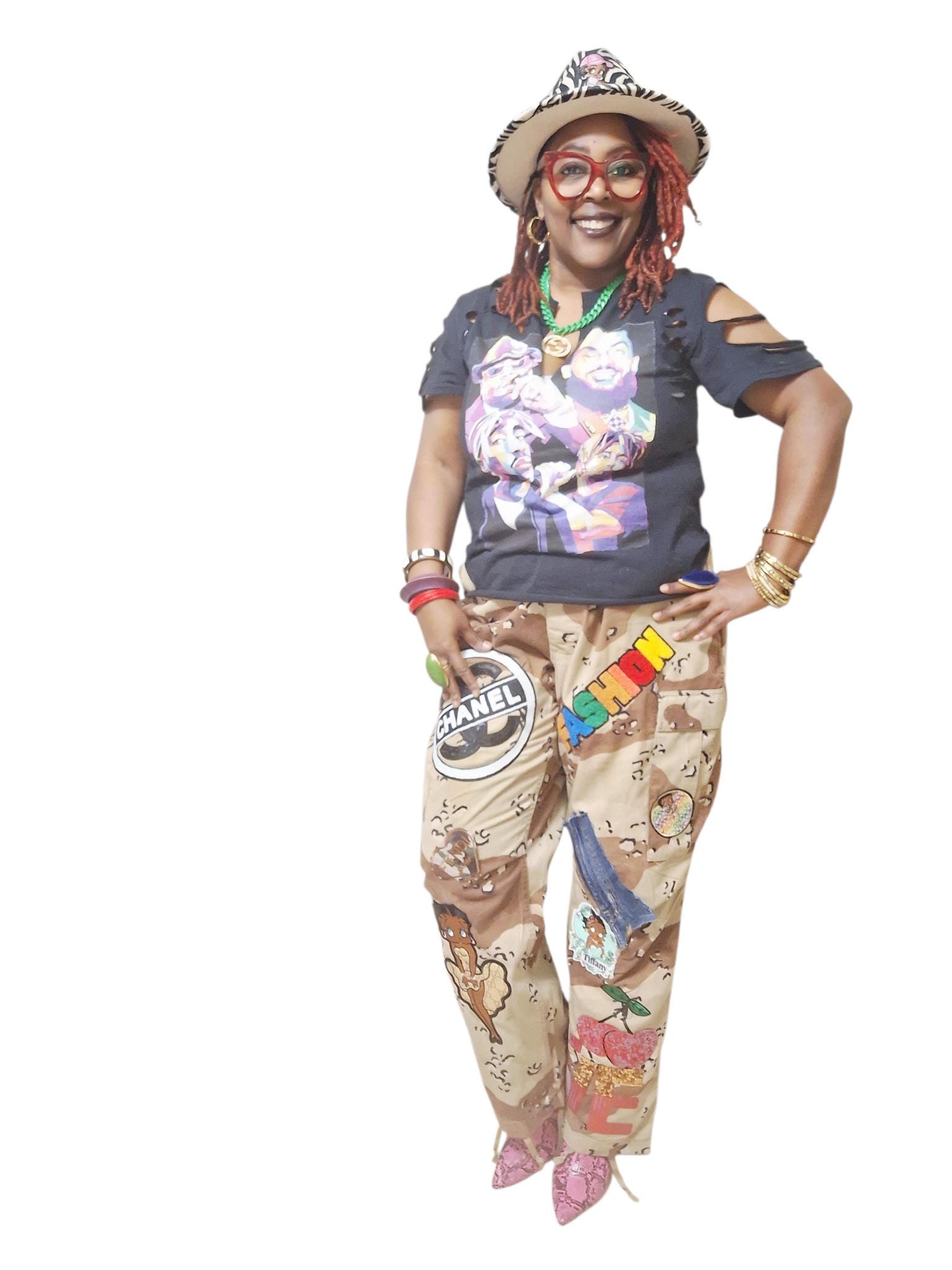 This is a upcycled and revamped authentic military pants. It is made using hand sewn denim pieces and various patches with hand drawn designs.