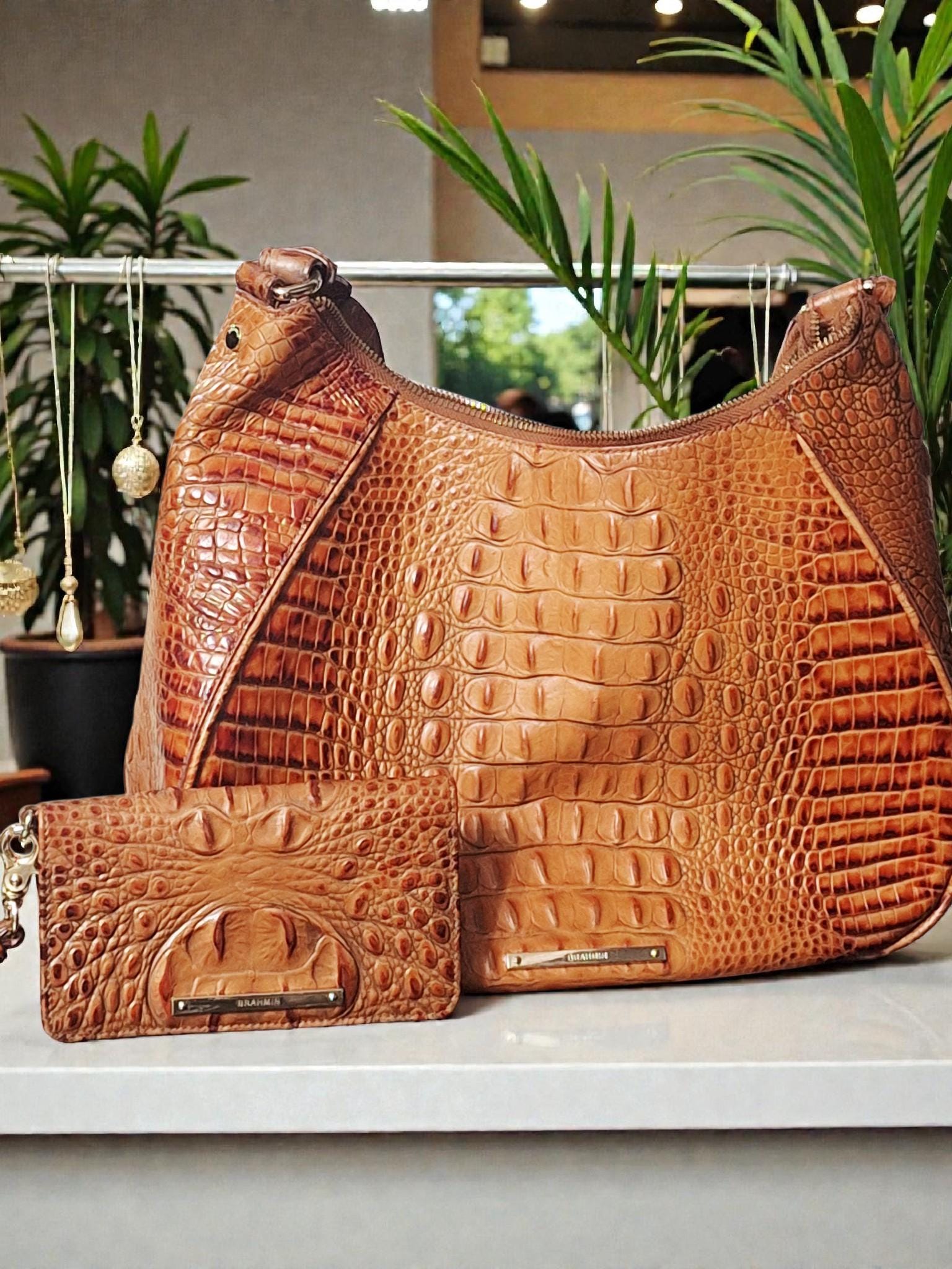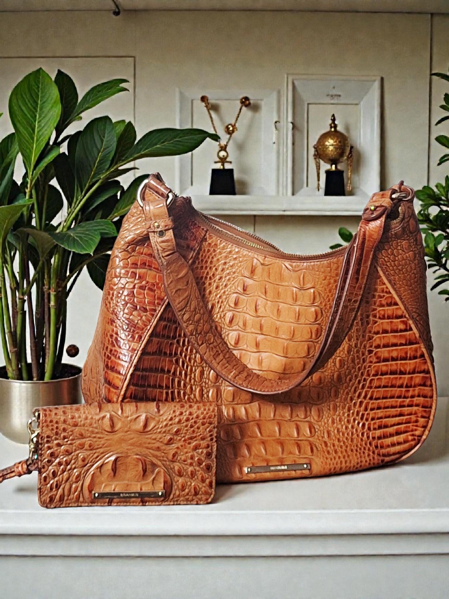 Keywords: Brahmin, crocodile leather print, animal print, designer handbag, everyday bag, travel tote, shoulder bag, fashion accessory, statement piece, chic, stylish, spacious