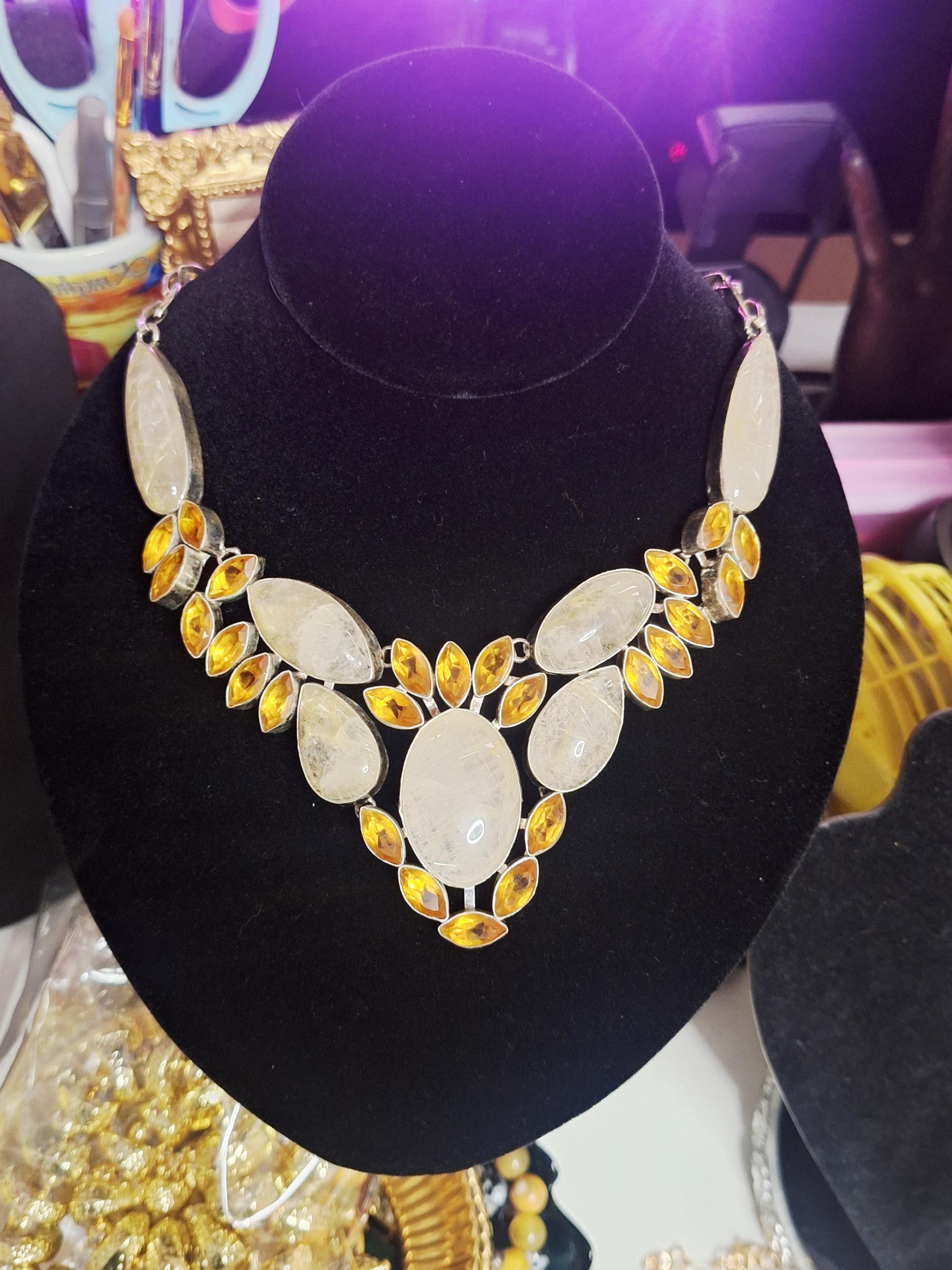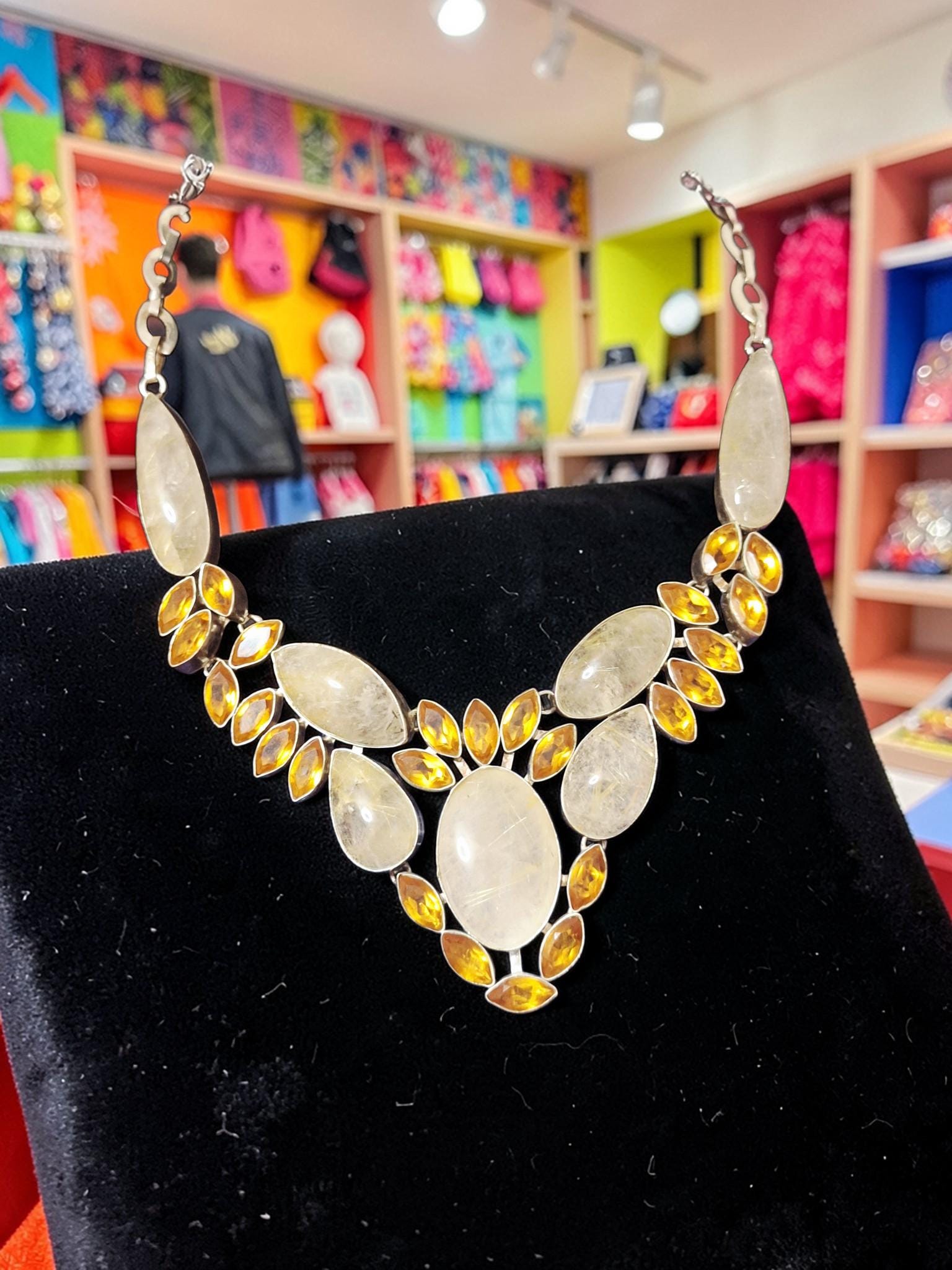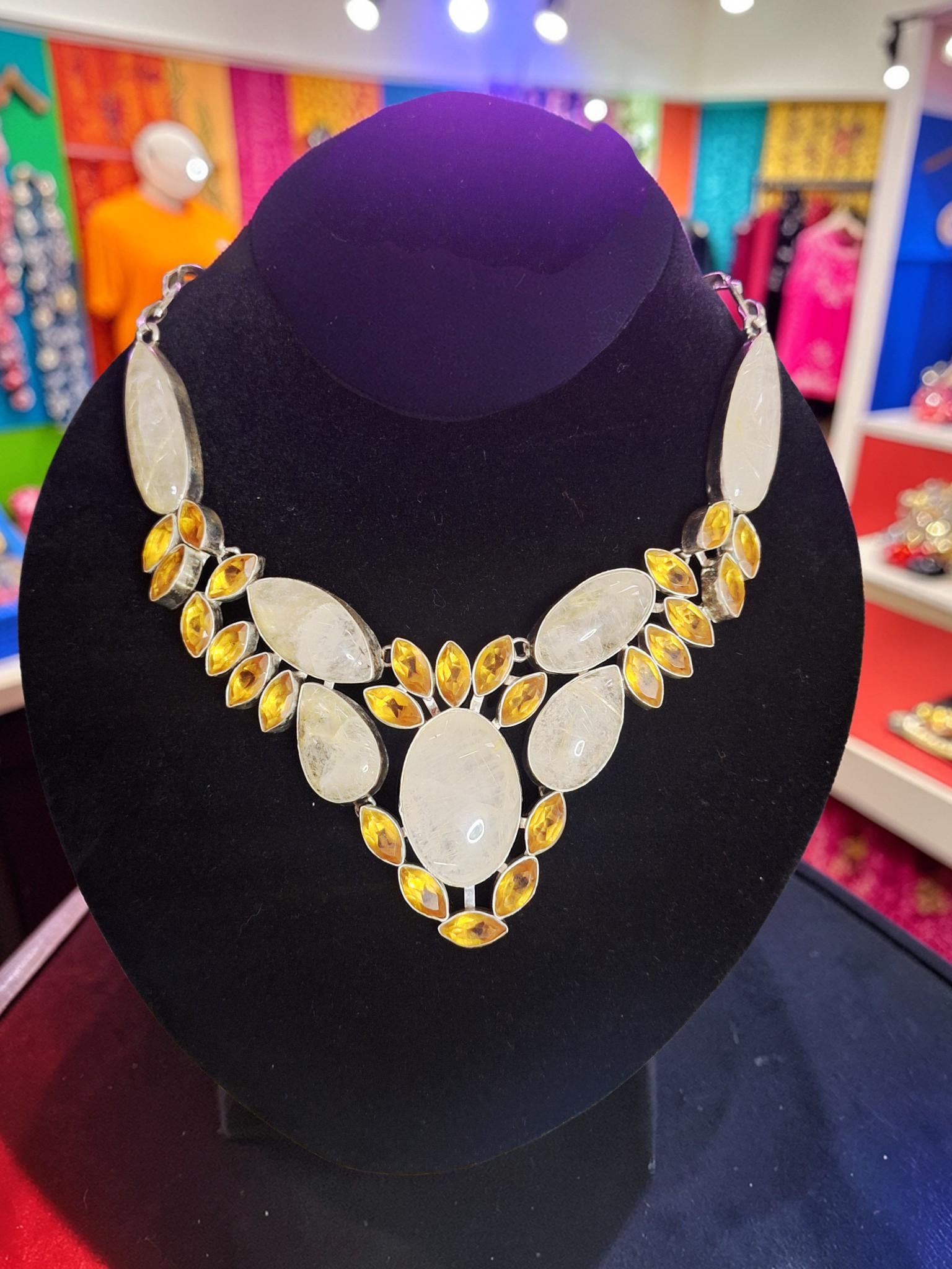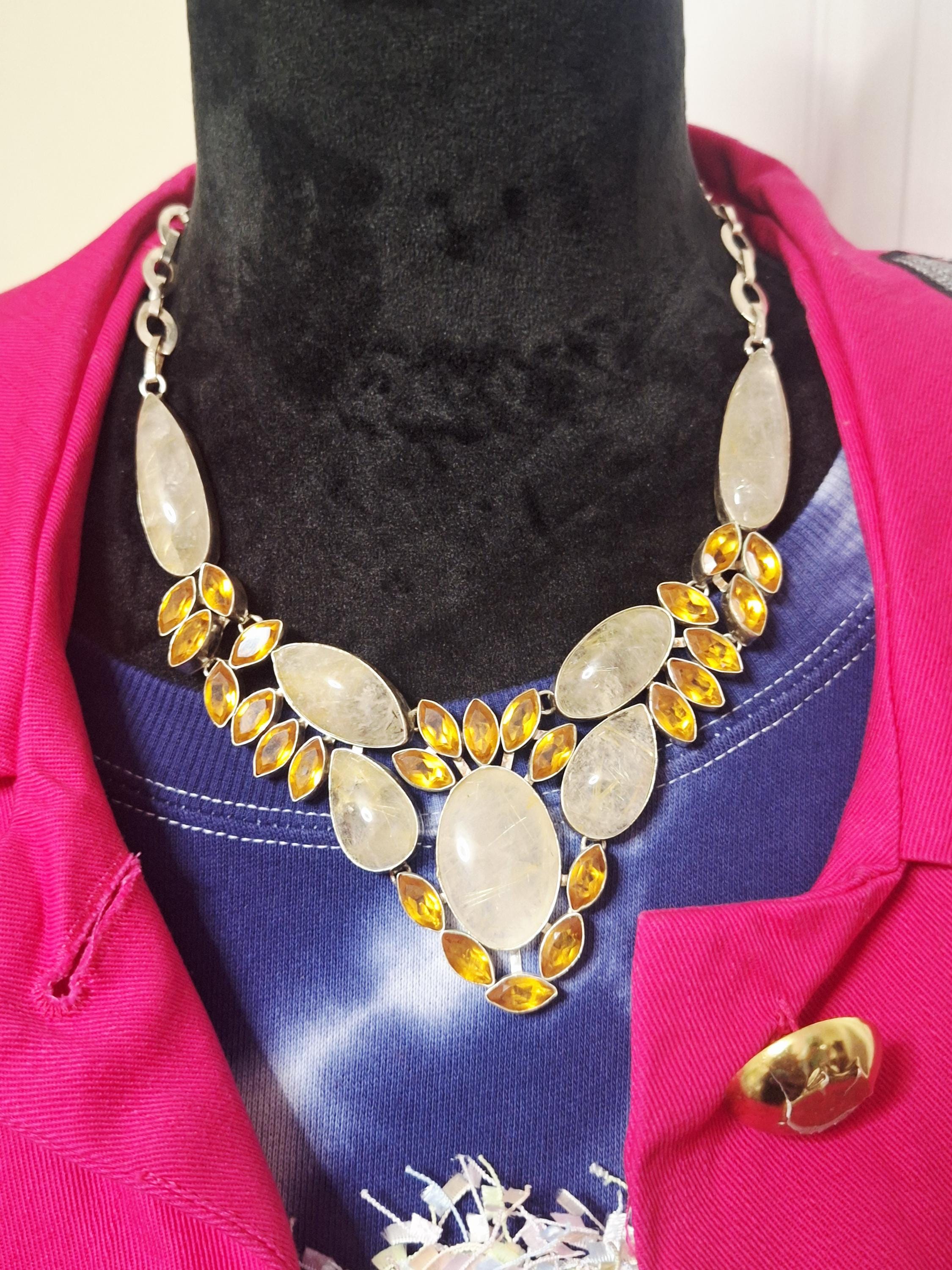Gemstone Citrine and Clear Quatz Cluster Silver Toggle Clasp Necklace