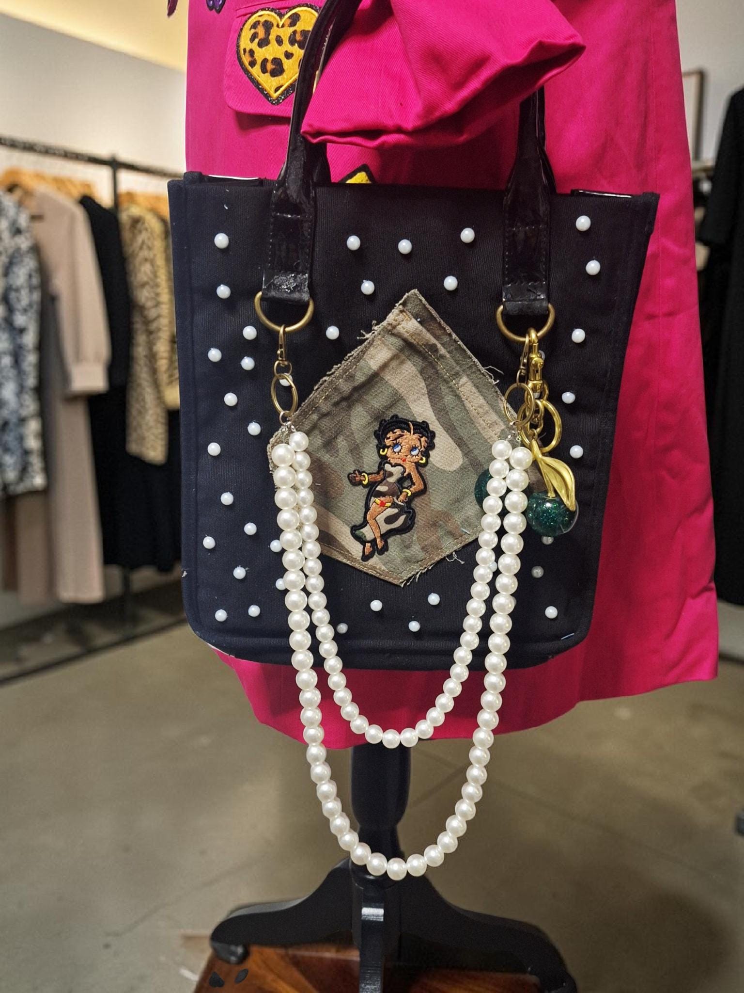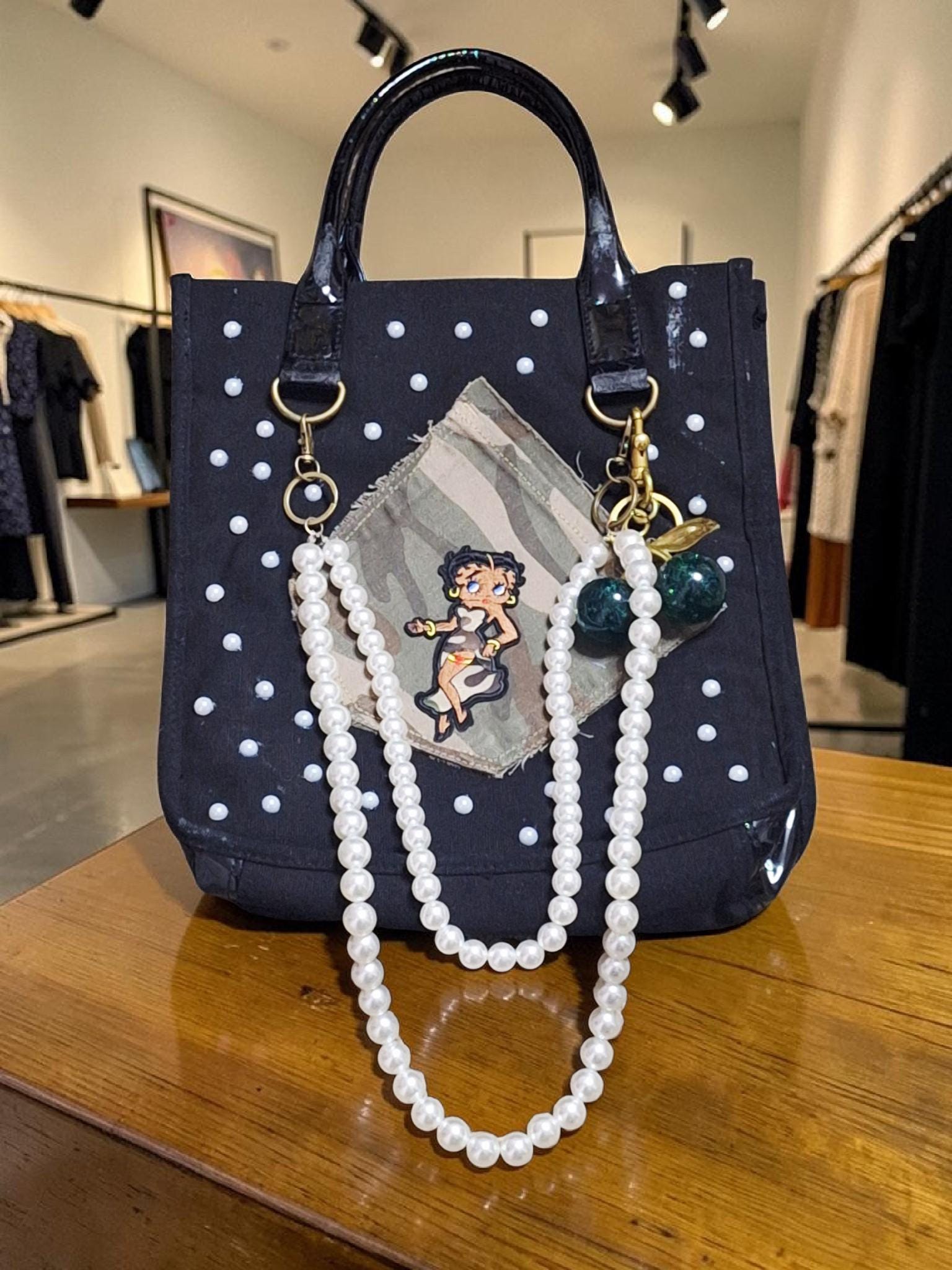 Upcycled denim distressed "Betty Boop" tote handbag.